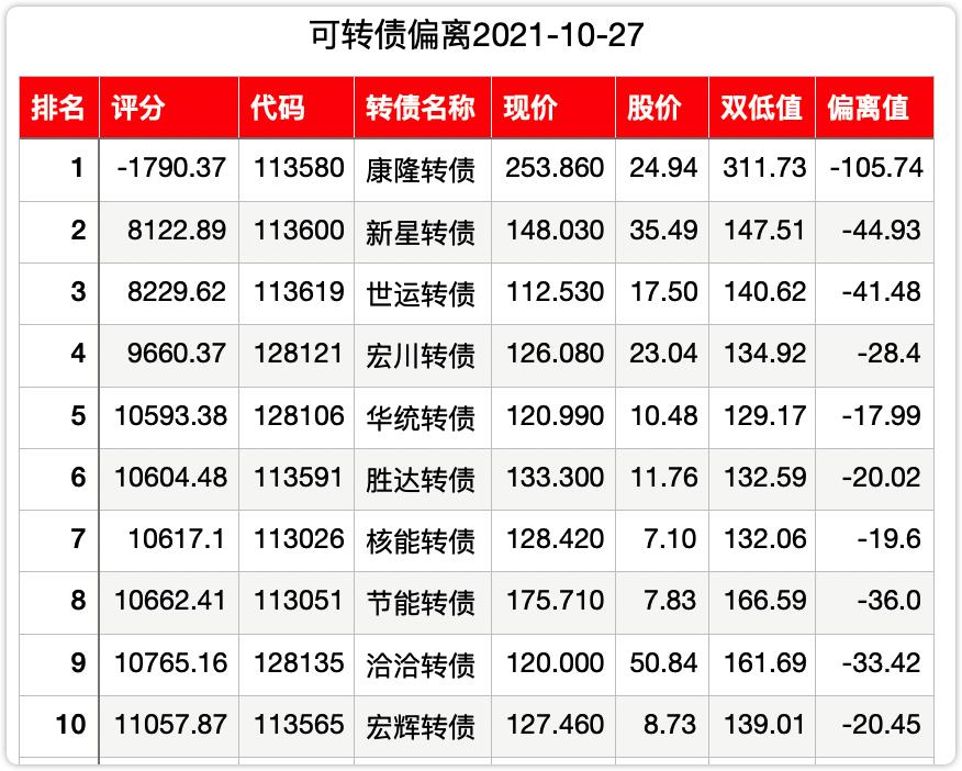 所以偏离值=可转债三月涨幅-正股三月涨幅,偏离值越小越好,为负数更好,而涨幅是百分比,所以偏离值还要乘上100。