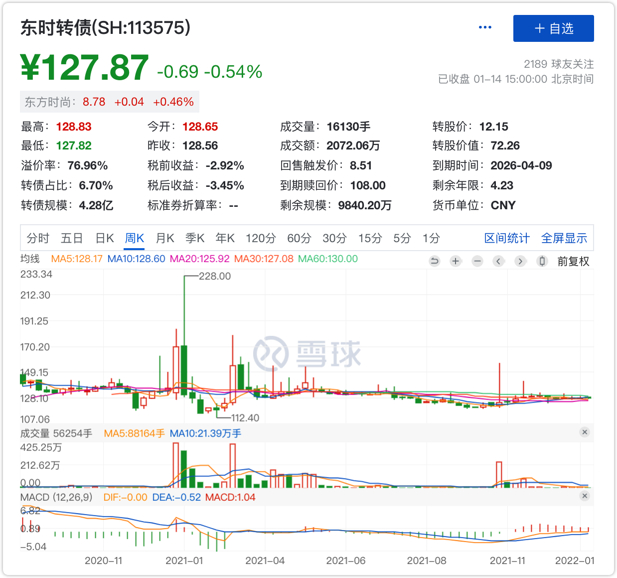 目前剩余规模在1亿以下,价格还在130元以下的转债,只有东时转债一只独苗。