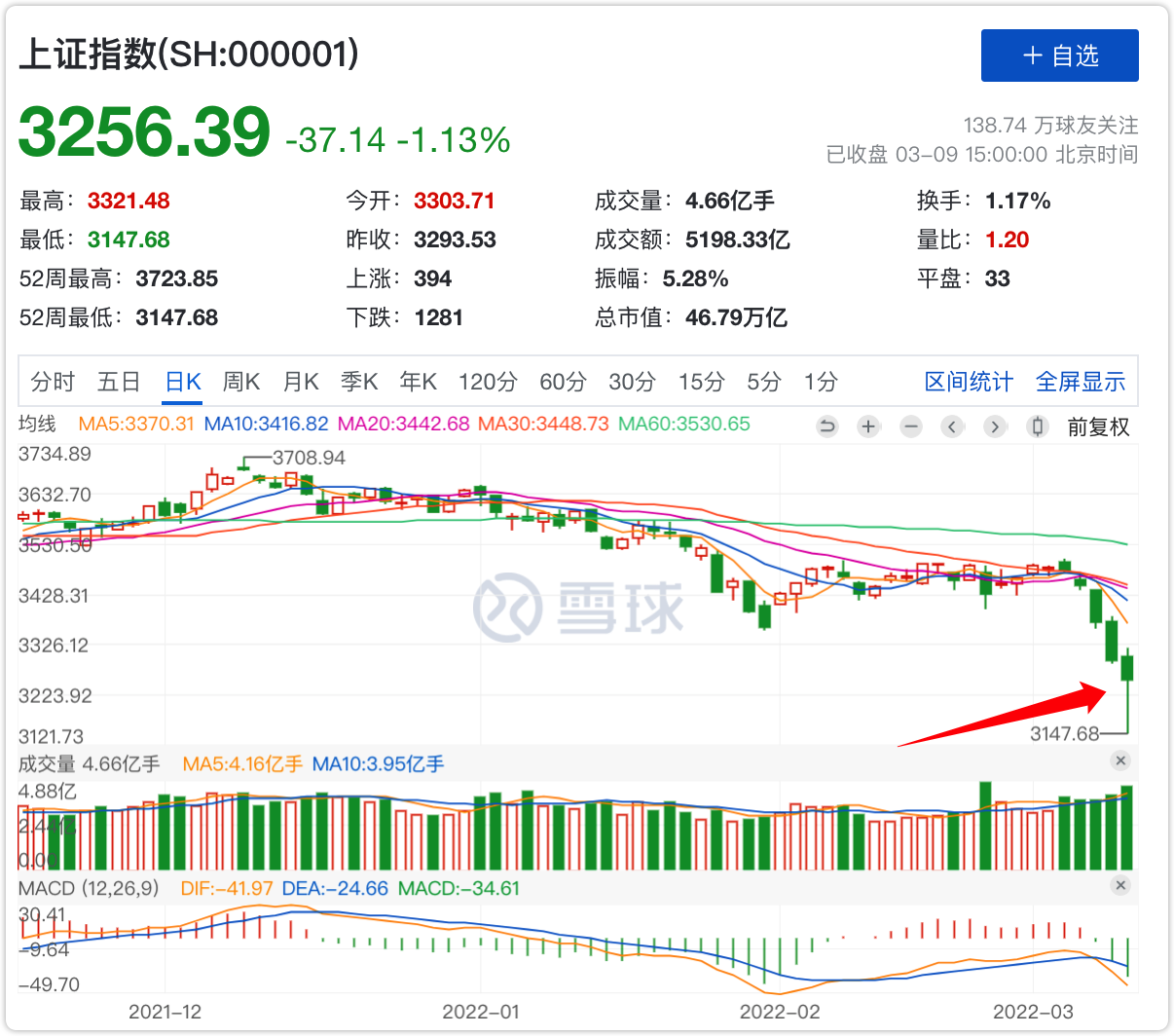 今天的上证指数走势,有个名词形容起来叫「金针探底」。