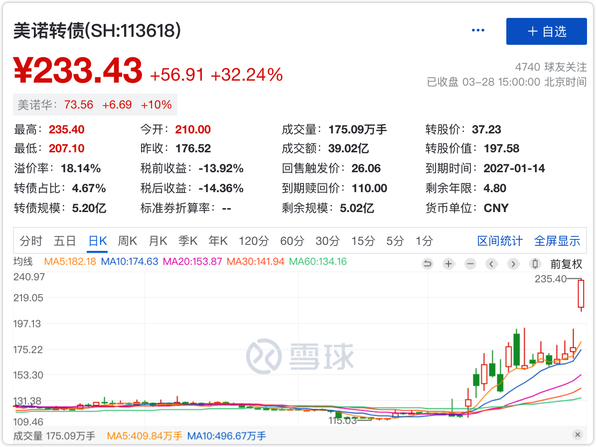 今天偏离名单第1名的美诺转债,暴涨32.24%,从176元一举冲上233元。