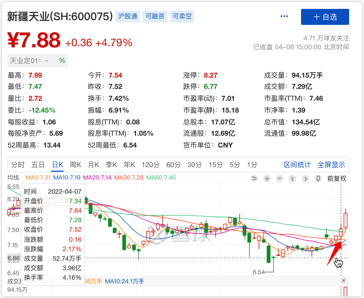 7.34元买入,当前7.88元,涨幅达到7.4%。