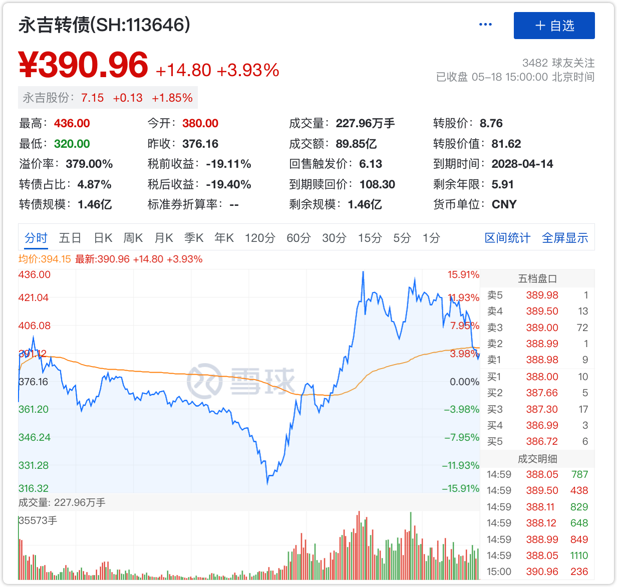 昨日收盘价376.16元,今日最高价436元,收盘价390.96元。