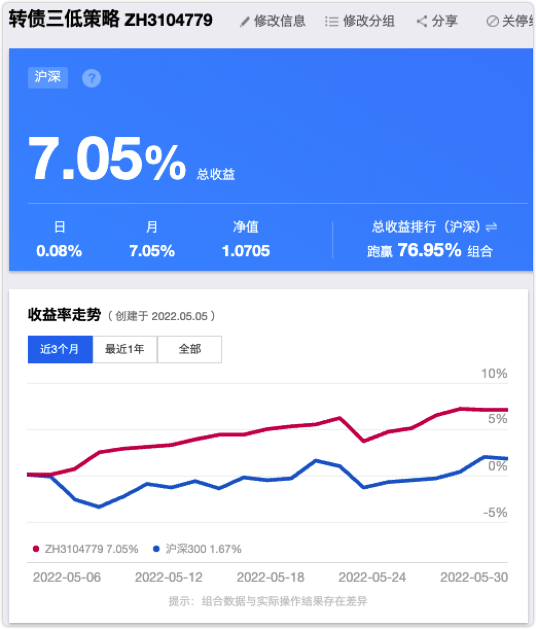 我今年推荐的三低策略表现也非常好,建仓不到一个月,收益7.05%: