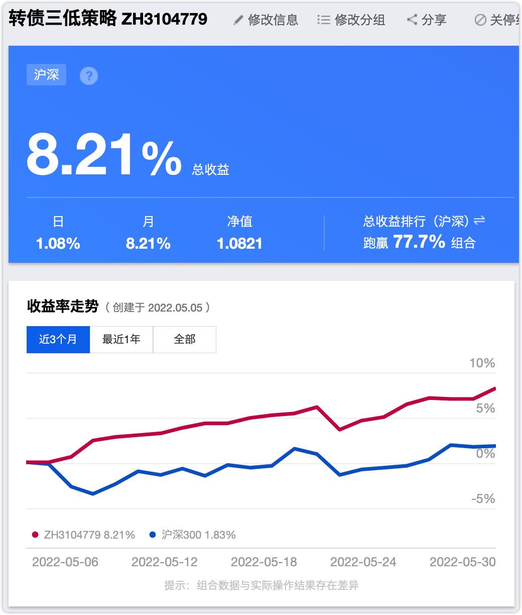 三低策略从2022-05-05建仓以来,不到一个月,收益8.21%,跑赢沪深300指数6.38%。