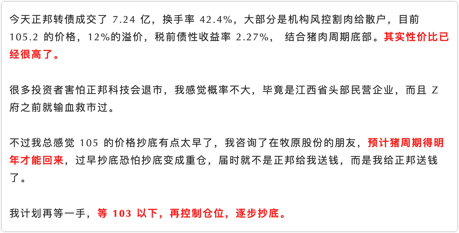 上周正邦转债大跌,我在文章中提出观点:105元抄底有点早,打算103元以下入手逐步抄底。