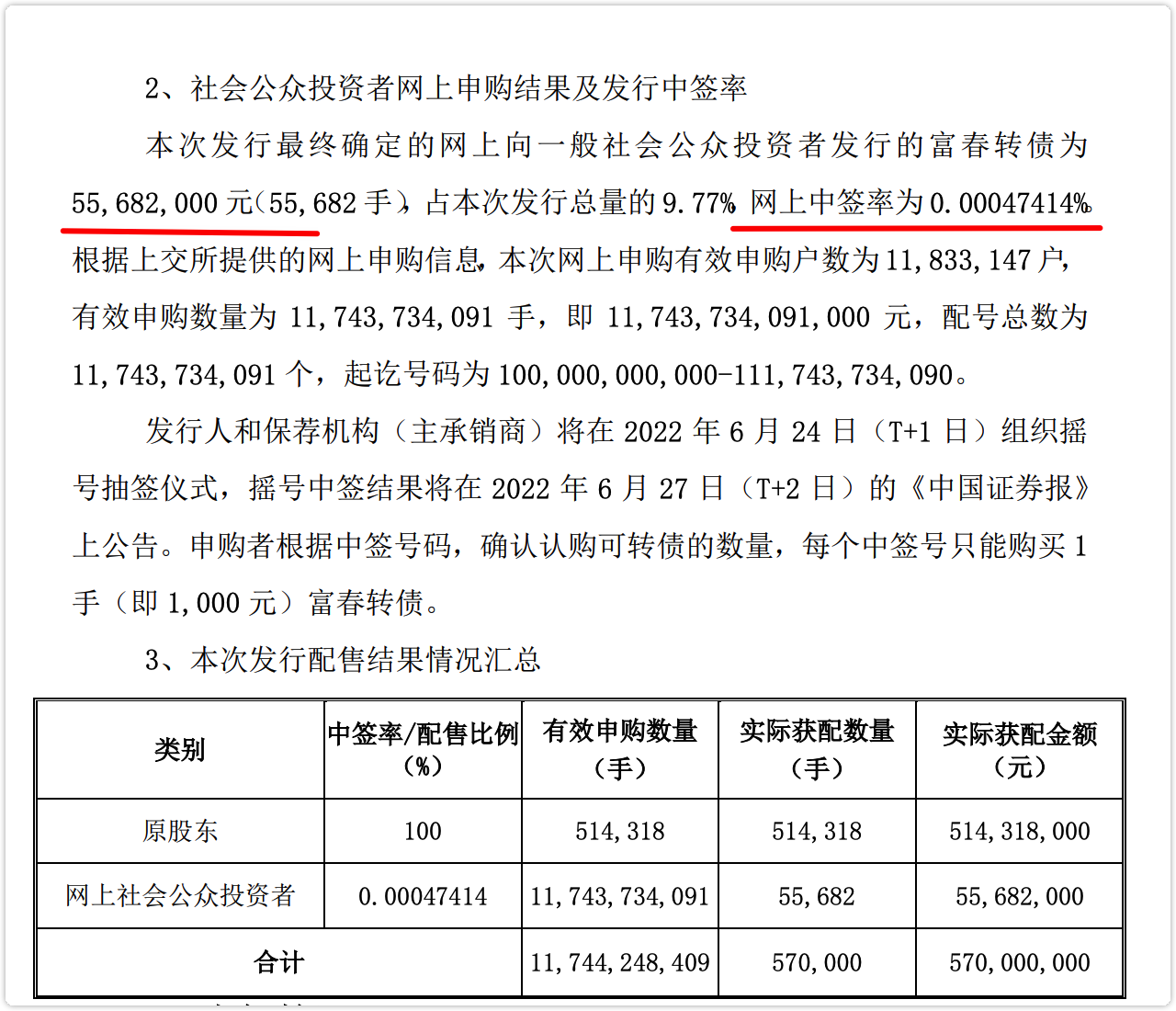 下午从富春染织的公告得知,此次富春转债网上中签率仅仅0.00047%,什么概念?