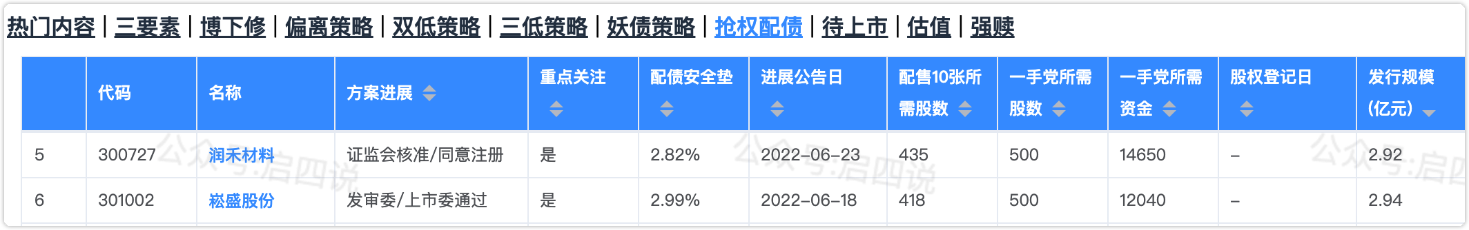 注:配债安全垫 = 预期收益/配售10张所需股数/正股价