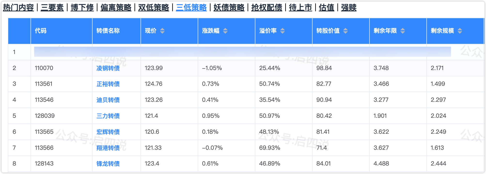 注:第一个马赛克是洪涛转债,虽然满足三低条件,但由于今天最后交易日并未买入。