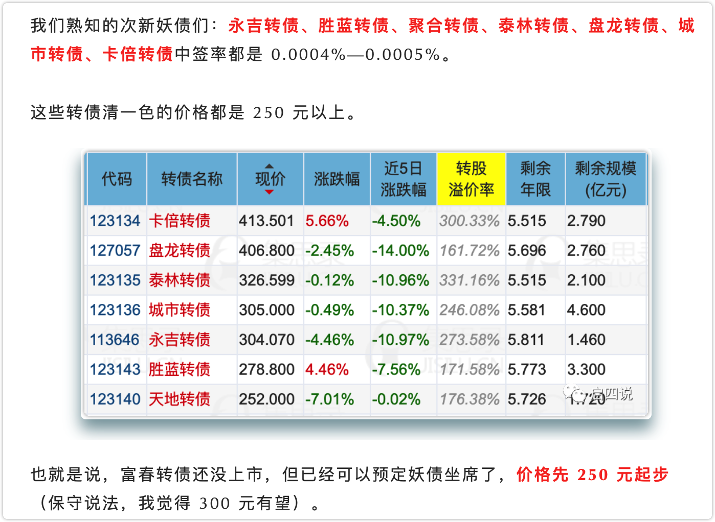 我在2022-06-23的文章:又双吃肉29%,富春转债预定大肉!中分析了富春转债上市流通份额只有 1.7 亿,和其它次新妖债类似,原本我预计上市冲击250元有望。
