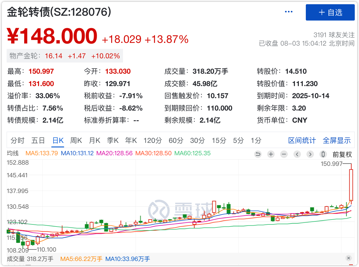 早上金轮转债突然起飞,具体原因不详,盘中按计划在147元左右止盈了大部分。