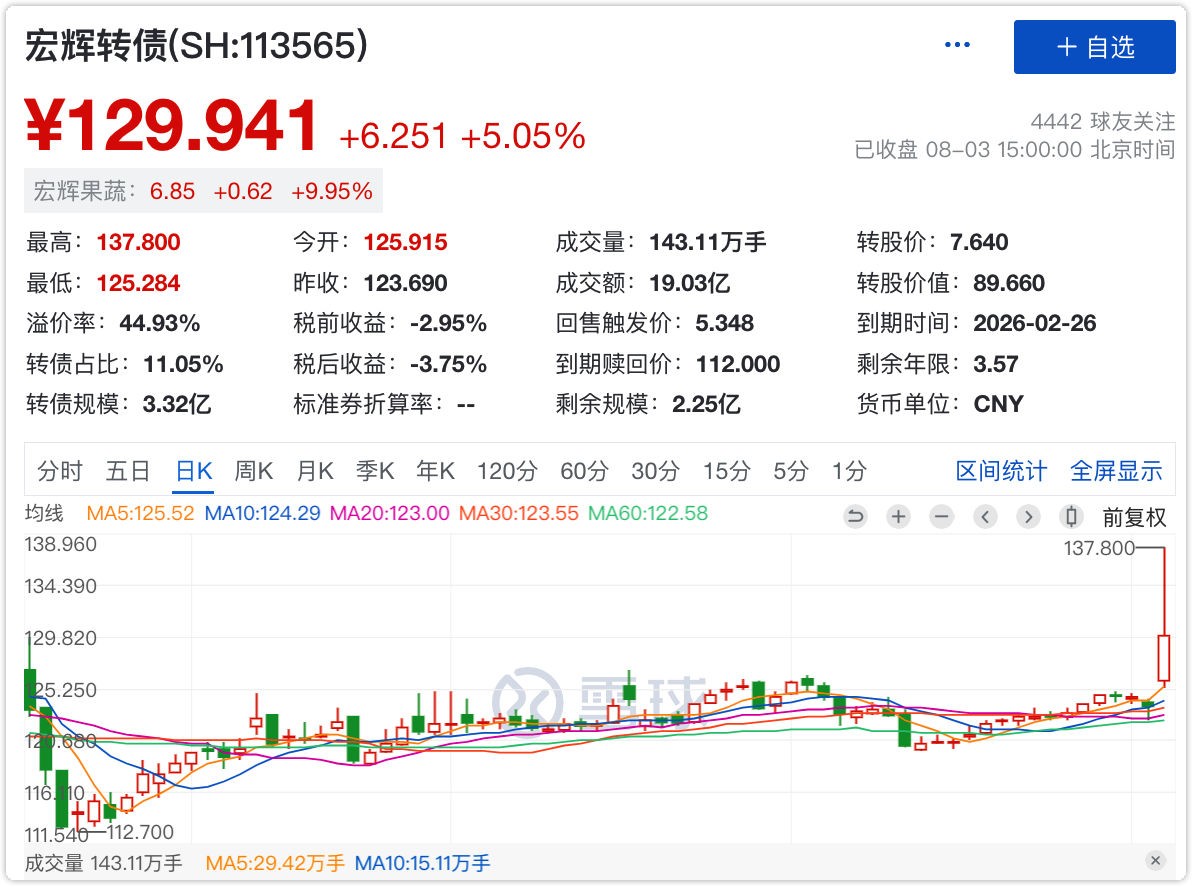 宏辉果蔬受益涨停,宏辉转债因此起飞,盘中按计划在135元左右全部止盈。
