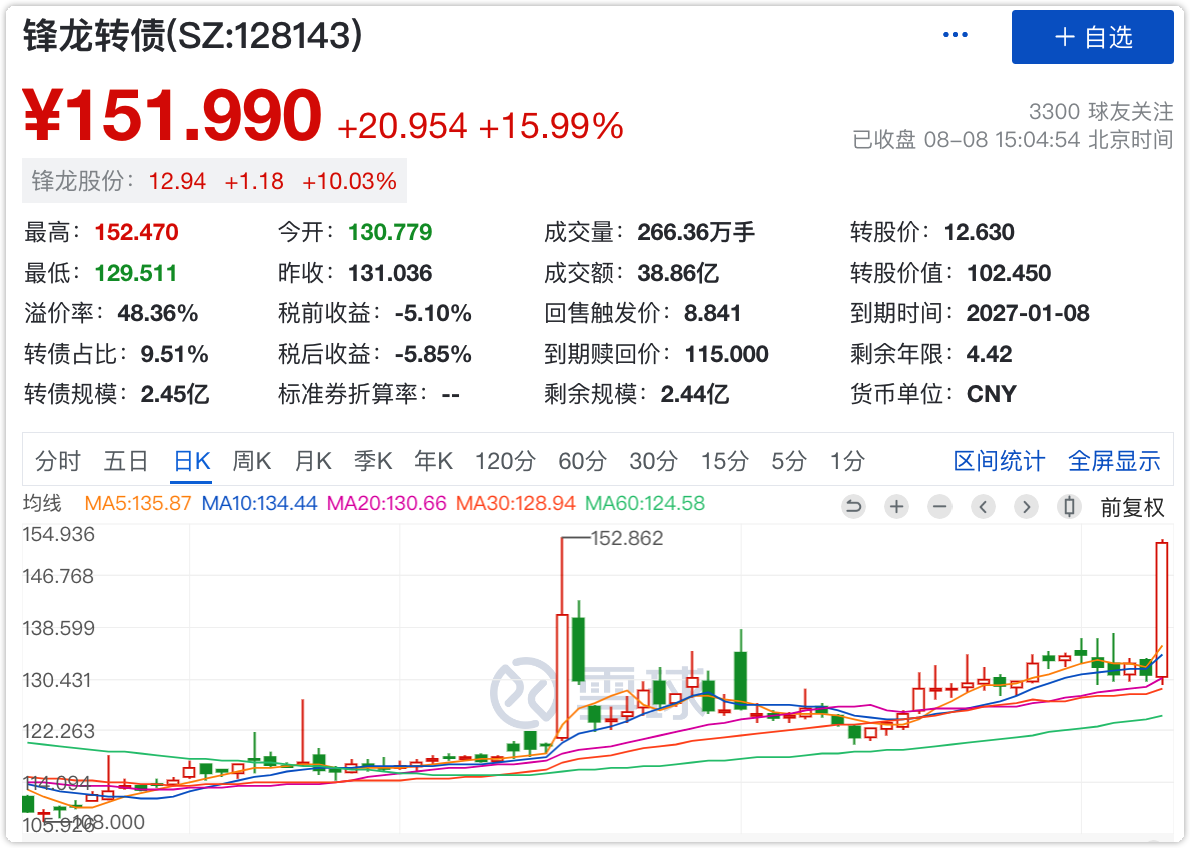 锋龙转债今日再次起飞,盘中最高价152.47元,收盘151.99元,涨幅+15.99%。