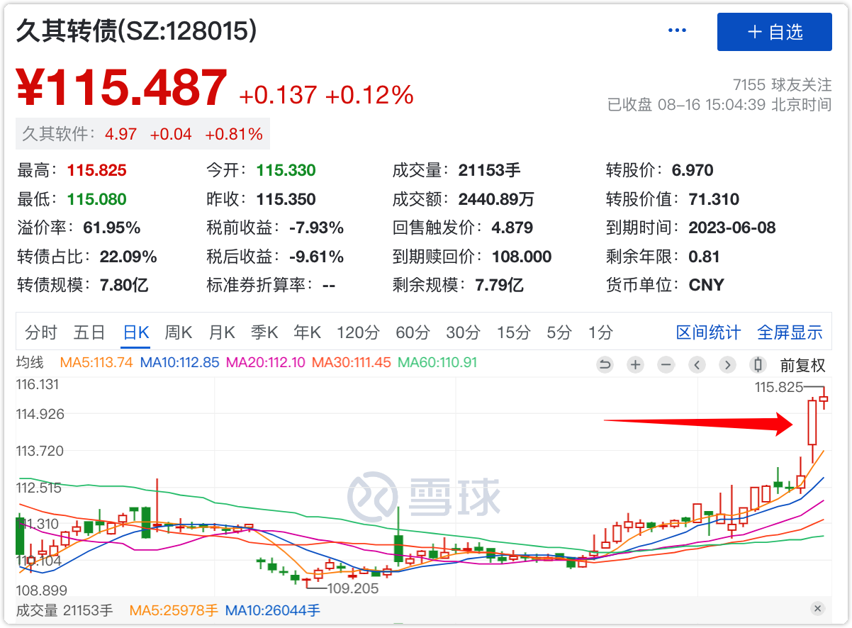 2)久其转债,到期赎回价108元,向下空间有限,剩余时间很短了,可以博弈下修+强赎。