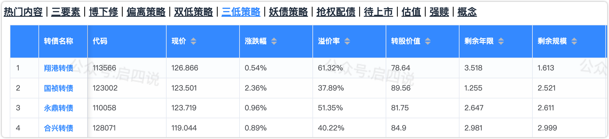 **持仓的13只三低转债12只上涨。**当前仅4只满足条件: