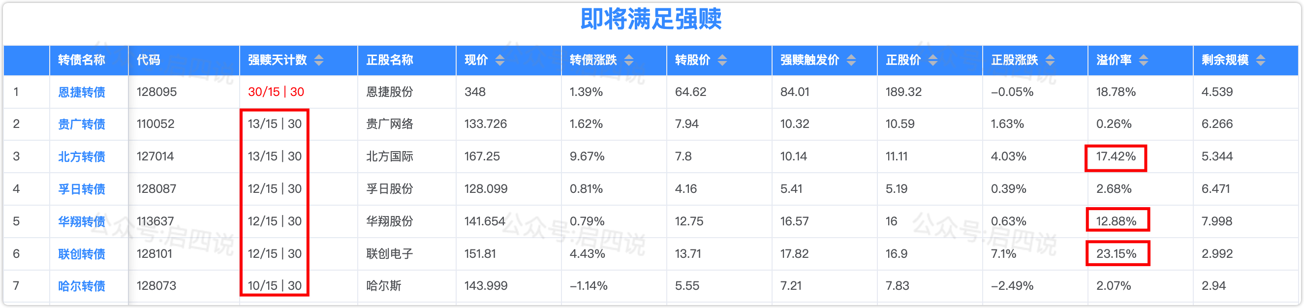 即将满足强赎的转债有:贵广转债、北方转债、孚日转债、华翔转债、联创转债、哈尔转债,强赎天计数如下图: