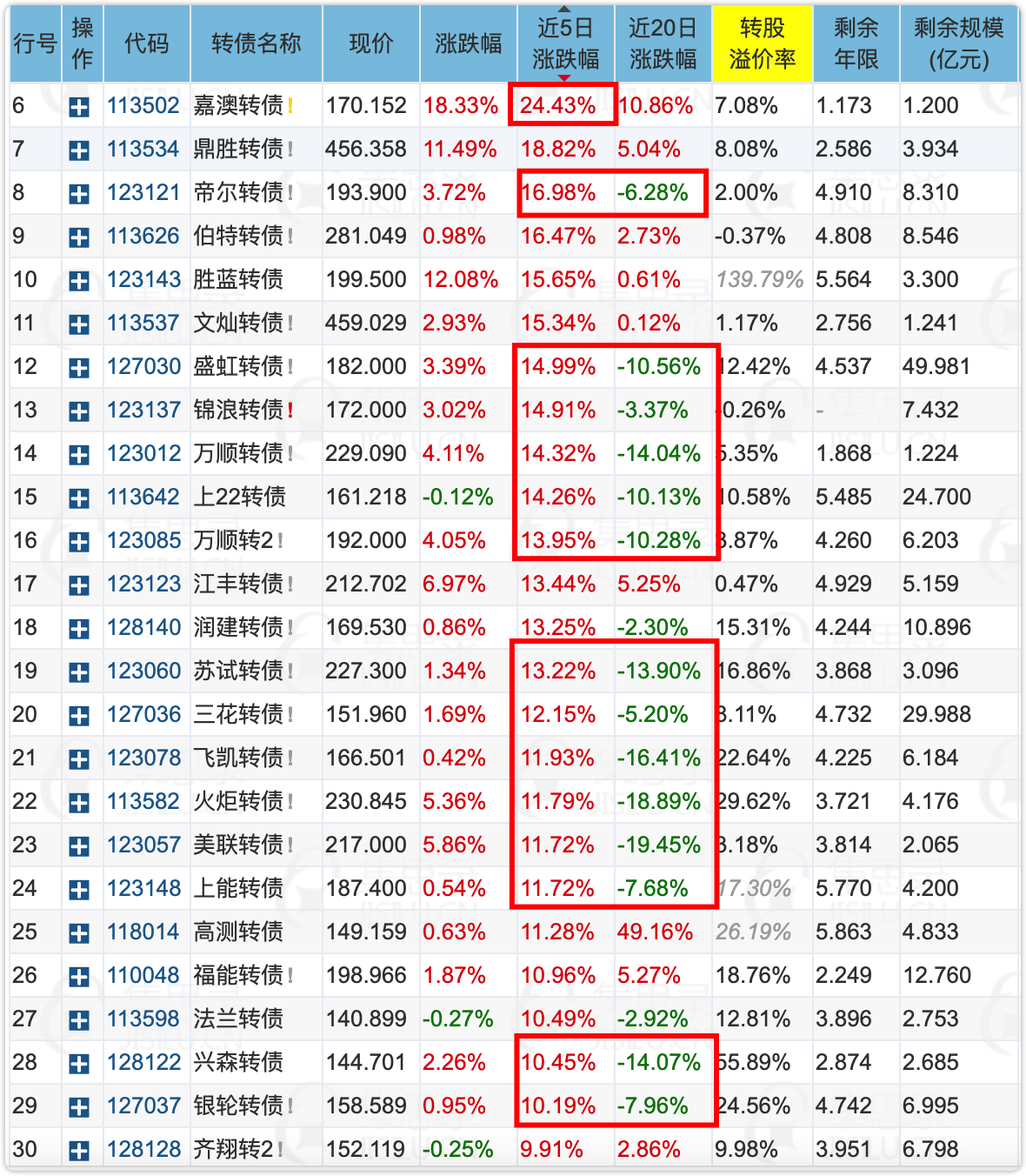 将可转债近5日涨跌幅,从大到小排序,去掉最近新上市的5只,排名如下: