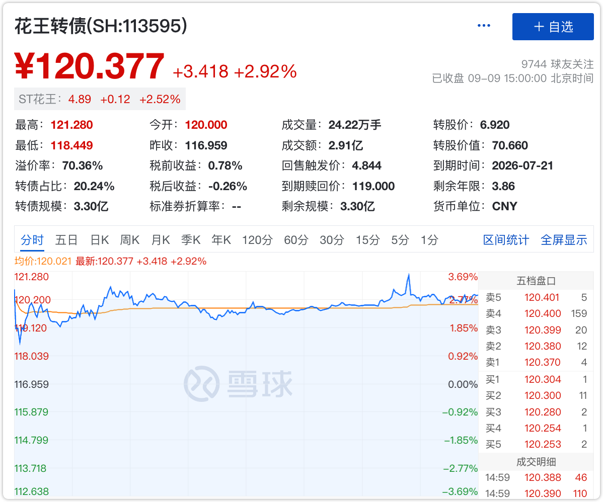 当前ST花王价格4.89,转股价4.48,对应的转股价值=100/4.48*4.89=109.15。