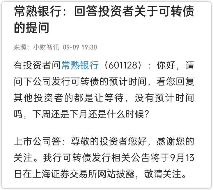 常熟银行预计将于2022-09-13公告正式发行转债。