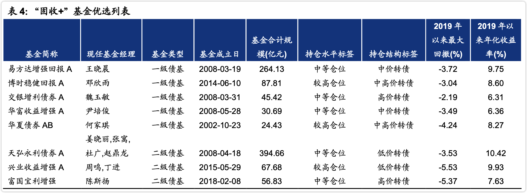 因此,在优选转债投资能力还行的“固收+”基金时,先筛选出个券挖掘能力较强的“固收+”基金,同时兼顾过往风险与收益表现(2019年以来最大回撤在6%以内,年化收益率在6%以上),给出符合当下转债市场的“固收+”基金列表,具体如下: