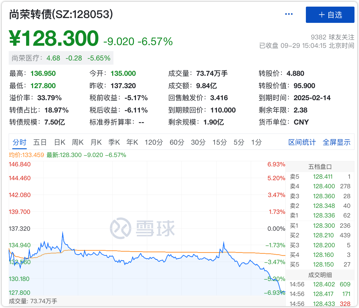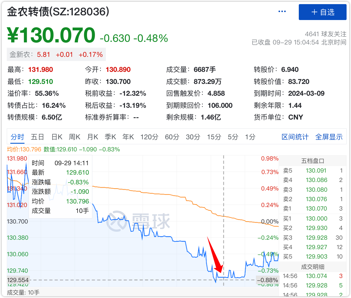 金农转债,剩余规模1.46亿,盘中网站监测到价格跌到了130元以下,而且剩余年限只有不到一年半。