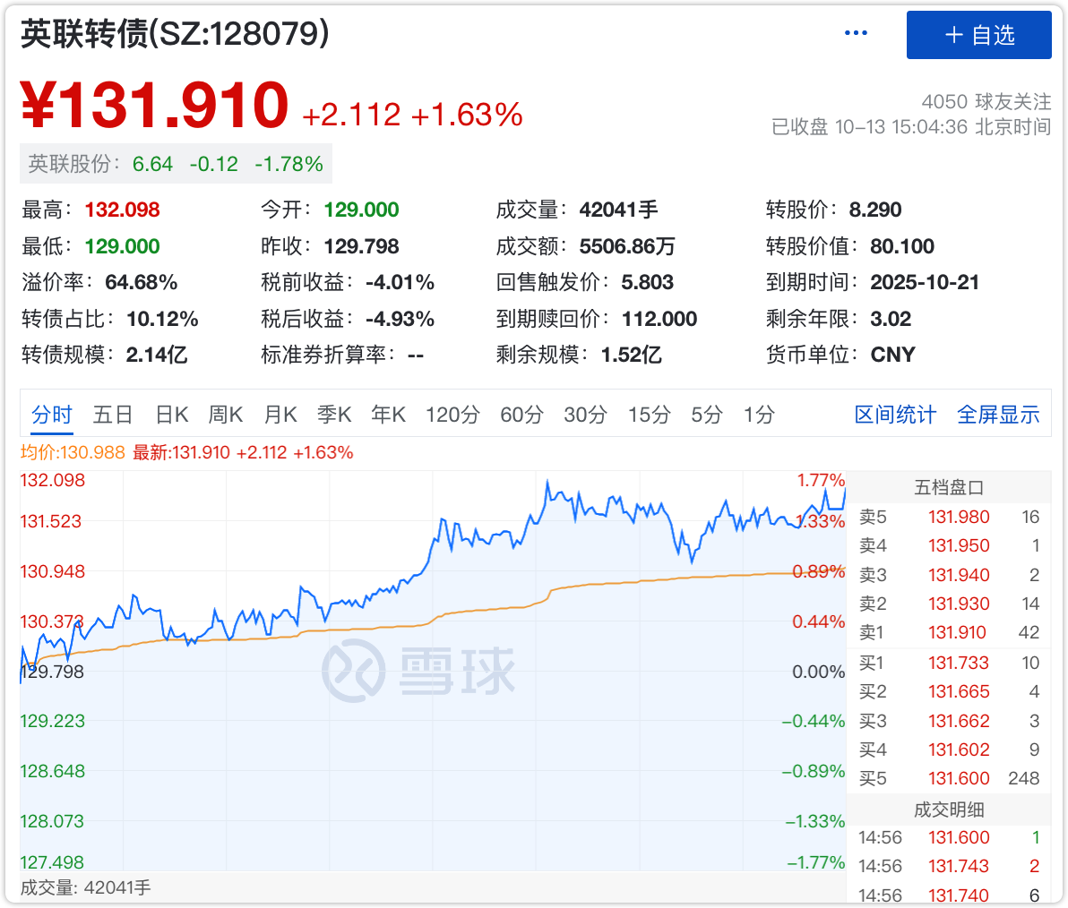 1、之前分享过的埋伏英联转债,成本价125元左右,今天收盘价131.9元,继续持有,准备135以上再考虑出手;