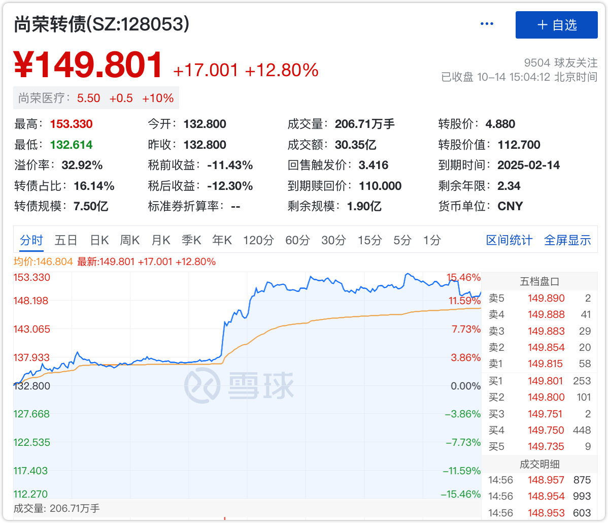 节前反复薅羊毛的尚荣转债,今天借着医药行情突然脉冲,最高冲到153.33元,不算之前的盈利,这次成本价129元,137.1元止盈部分,150.3元全部止盈,本次吃肉11.4%左右。