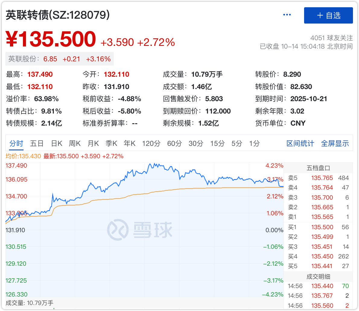 昨天提到之前分享过的埋伏英联转债,成本价125元左右,准备135以上再考虑出手,今天不负所望顺利冲上135,最高价137.49元。