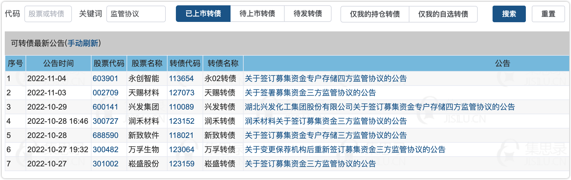 因为监管协议通常都是发债完成之后签订,可以参考下图中最近上市的转债,都是在发债完成之后签订。