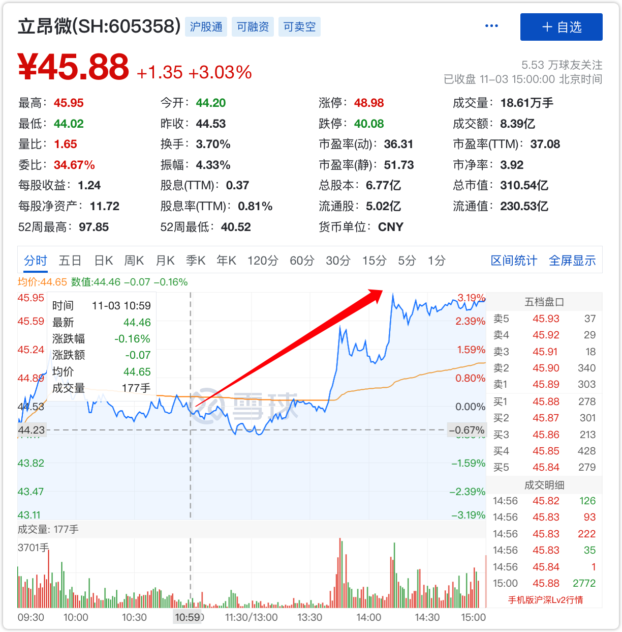 事后看,买入节点比较幸运,下午芯片概念突然热起来,建仓价44.46,收盘价45.88,盈利3.19%。