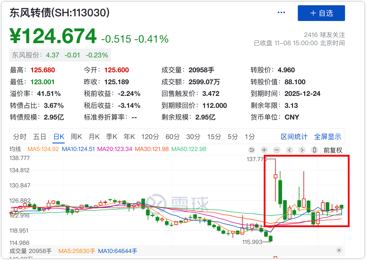 当前溢价率41.51%,125元以下的价格尚可接受。