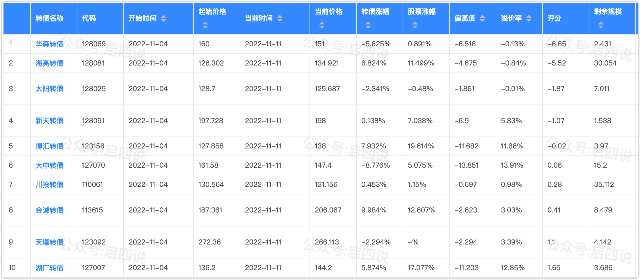本周五收盘后偏离策略名单前6位:华森转债、海亮转债、太阳转债、新天转债、博汇转债、大中转债。其中太阳转债即将到期,调仓时会往后顺延替换掉。