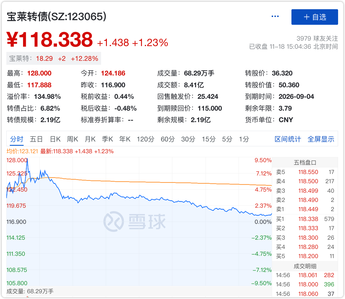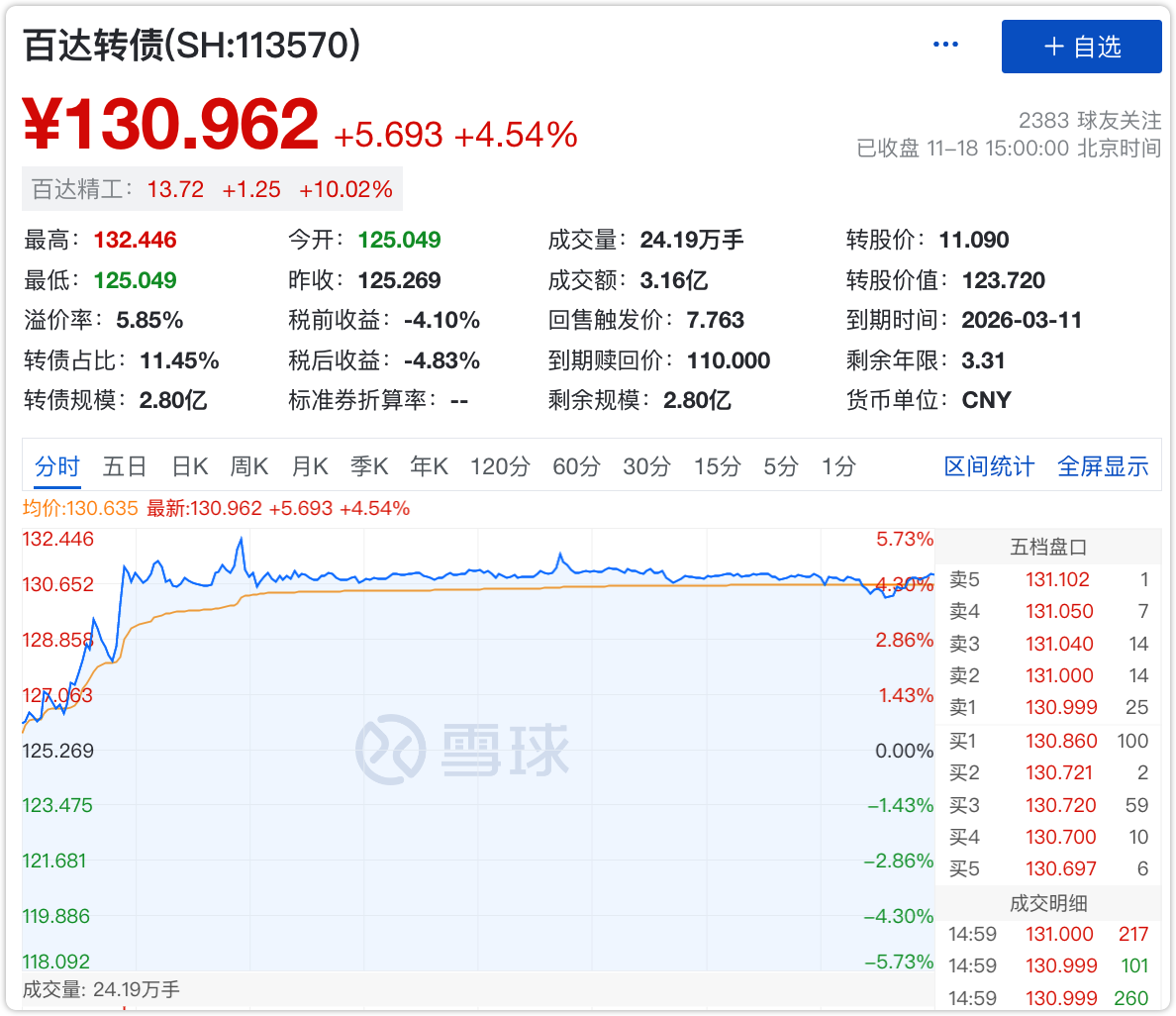 今天正股突然冲高涨停,转债最高价来到128元,最高涨幅9.5%。