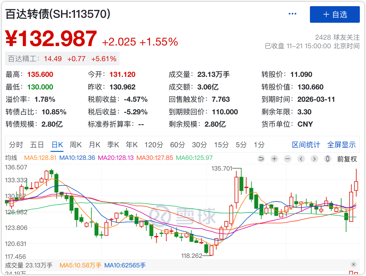 百达转债,则继续上涨,最高价达到了135.6元,触发了止盈价。