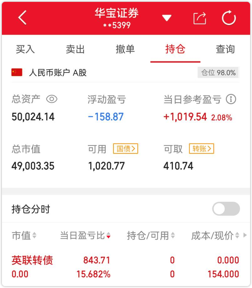 得益于英联转债,这个实盘账户今天大涨2.08%。