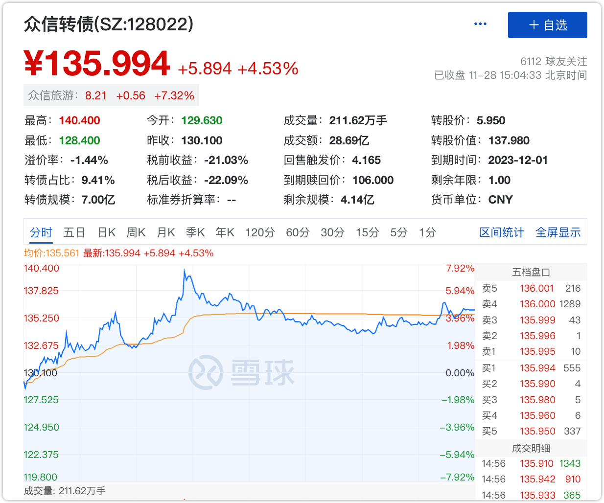 可惜众信转债很快就上了130元,并一发不可收拾,今天最高价来到了140.4元。