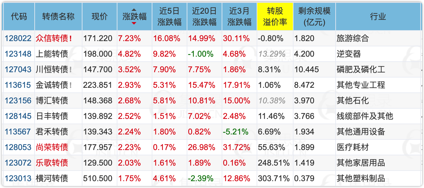 涨幅榜主要集中在旅游、储能、抗原检测相关板块,其中众信转债近5天涨幅16%,之前薅羊毛错过了这只大牛债,有利有弊。