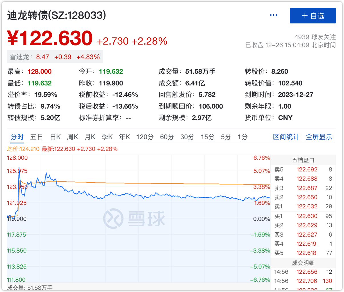 **2、**迪龙转债也是非常适合做网格的一只转债,非常活跃,今天最高价来到了128元。