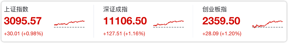 三大指数高开高走,截至收盘,沪指涨0.98%,深成指涨1.16%,创业板指涨1.2%。沪深两市全天成交额6686亿元。两市超3000只个股上涨。