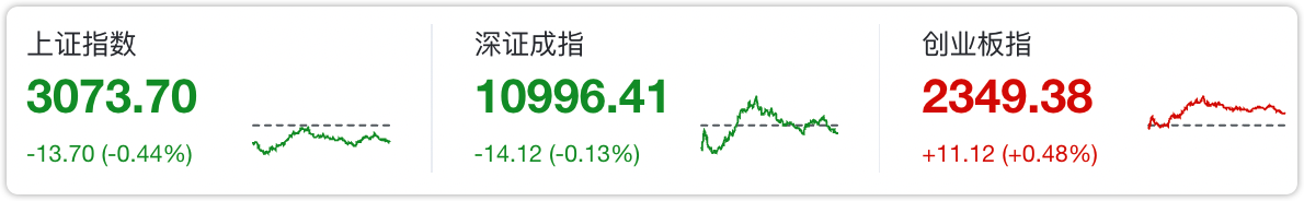 三大指数收盘涨跌不一,截至收盘,沪指跌0.44%,深成指跌0.13%,创业板指涨0.48%。沪深两市全天成交额6147亿元。两市超3300只个股下跌,北向资金半日净卖出11.1亿元。