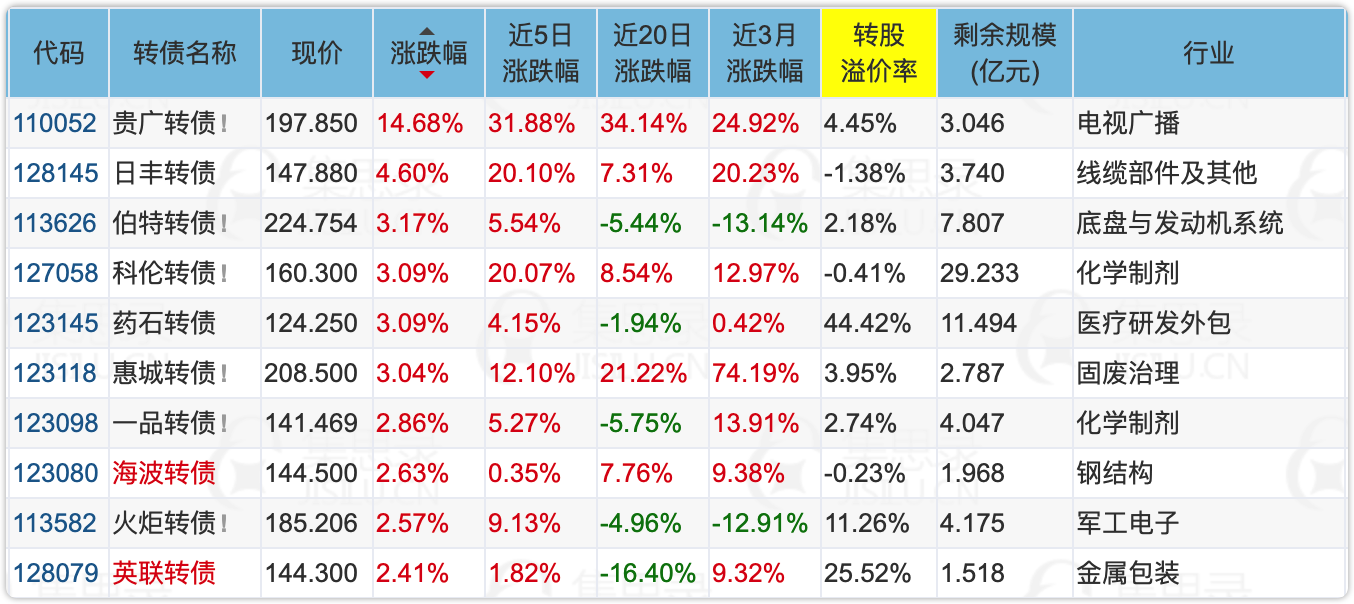 第1名的贵广转债,近期由于习酒借壳事件被反复炒作,今天一举冲上200元,和此事件相关目前最受关注的是贵广网络和贵绳股份。