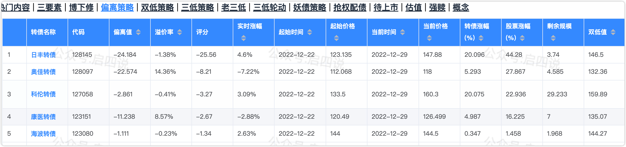 今天收盘后观察到偏离策略前2的日丰转债和奥佳转债,最近一周转债涨幅严重落后于正股涨幅,日丰转债落后24%,奥佳转债落后22%。