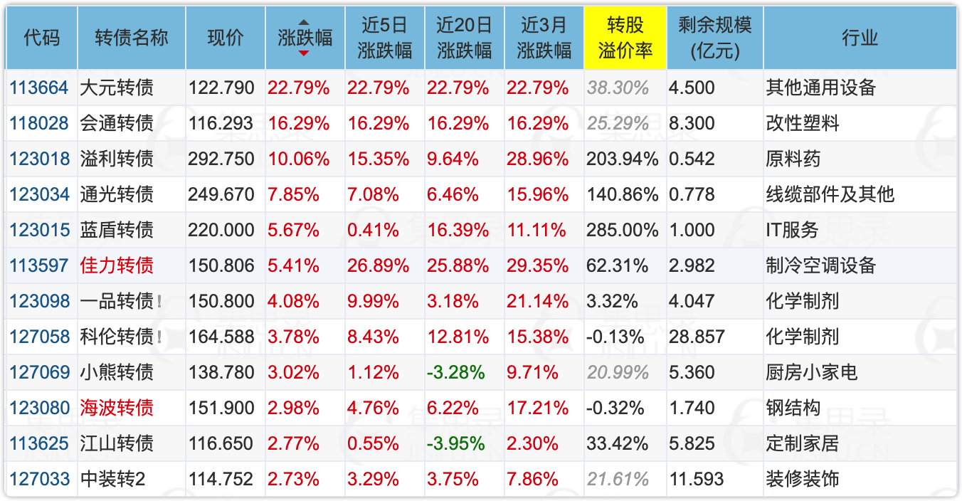 老妖债溢利转债、通光转债、蓝盾转债今天又登上涨幅榜前列。