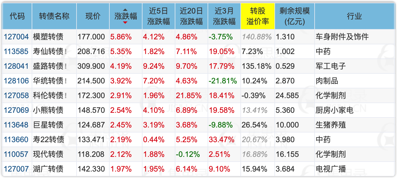 2、提示一个很大的风险:模塑转债,今年6月就到期了,转股价值73.48,目前溢价率140.88%,如果不下修的话,强赎基本不可能了,到期赎回价110,目前价格180,就是游资在击鼓传花。