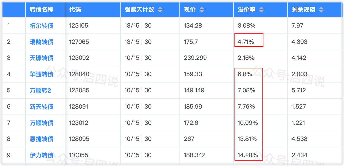3、恩捷转债,周末突然发布了可能强赎提示性公告,之前多次满足条件沉默不语,这次突然发声,强赎可能性估计比较大,目前溢价率还有13.81%,风险很大。