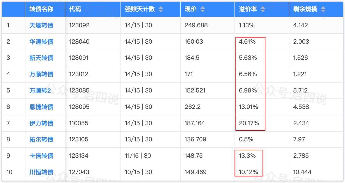 天壕转债、华通转债、新天转债、万顺转债、万顺转2、恩捷转债、伊力转债都只差1天就满足强赎条件了,溢价还较高,风险很大。