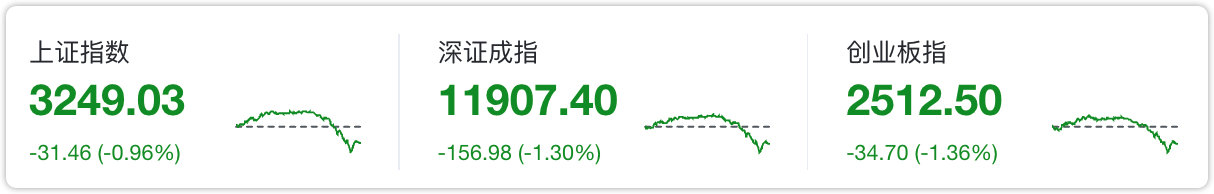 大盘午后跳水,创业板指一度跌超2%。截至收盘,沪指跌0.96%,深成指跌1.30%,创业板指跌1.36%,两市超4500只个股下跌。两市全天成交额11930亿元,北向资金逆市净买入67.94亿元。