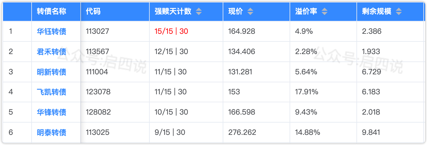 下面这些转债,要注意强赎杀溢价风险,尤其是溢价率在5%以上的。