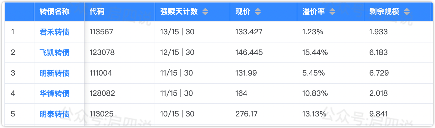 下面这些转债,要注意强赎杀溢价风险,尤其是溢价率在5%以上的。