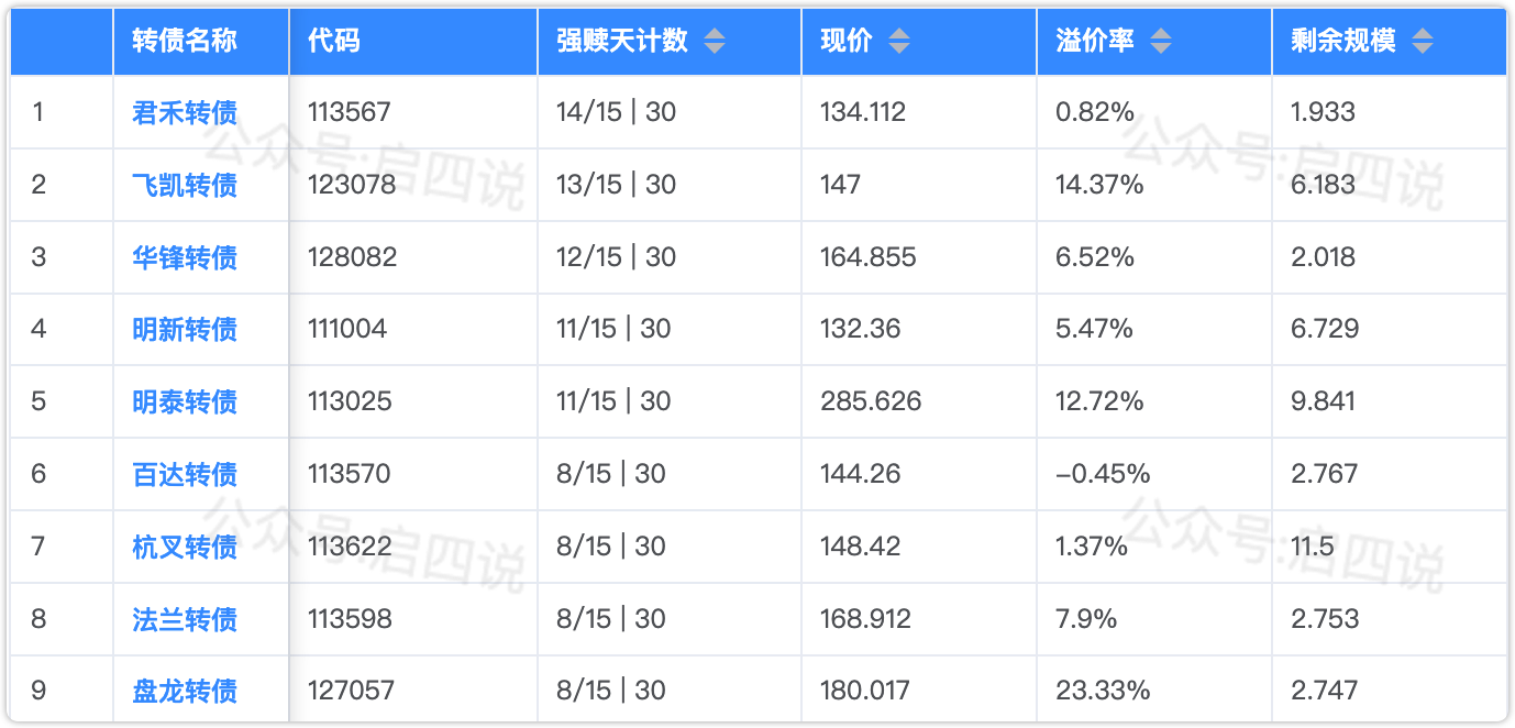 下面这些转债,要注意强赎杀溢价风险,尤其是溢价率在5%以上的。