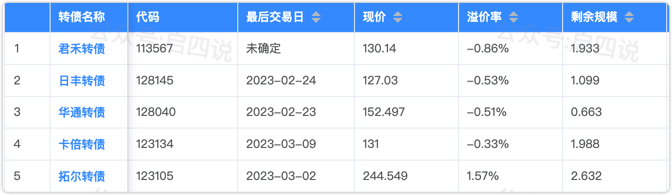 2、特纸转债,多家纸企计划3月5日提价,正股五洲特纸今天涨停,但是特纸转债只上涨2.95%,因为它快满足强赎条件了,算了一下进度,未来9天特纸转债暂无法满足强赎条件,当前溢价1.44%还算安全,如果未来其回落值得关注。